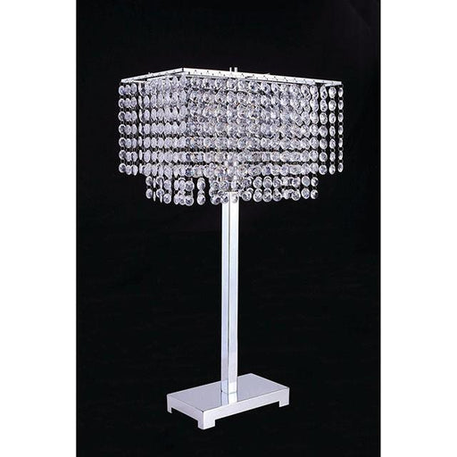 FOA WestRENA Table Lamp, Hanging Crystal, 15"L X 9"W X 27"H, 7.55lbs. Diamond-cut faux crystals, which act as a unique shade, sit atop a metal base, giving...