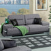 Sleek and contemporary, this seating group features large padded arms, with finer details like double stitching on the seat cushions and silver accents. The matching pillows have a darker shade in contrast to the espresso leatherette or gray fabric seat and back.