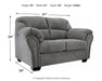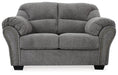 Why sacrifice comfort for style (or style for comfort) when you can have the best of both in this loveseat in pewter gray. Elements include a chic divided-back design and pillow top wrapped armrests that make nodding off all too easy. Calling attention to the elegantly flared armrests—black nickel-tone nailhead trim for a punch of cool character.