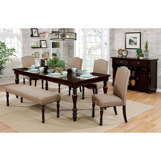 HOLCROFT Antique White/Ivory Dining Table, 100"(64" + 2 X 18"Leaf)L X 44"W X 30"H, 121lbs. Bring elegance to the table with this fine collection of furniture! Gently turned legs add a level of sophistication to a design enhanced by the antique finish and appearance of the spacious tabletop. Padded fabric upholstery lines the backrest and s eat of each coordinating chair, providing a comfortable place to sit for a full-course meal. Invite the entire family over to enjoy a lovely feast all together at one table. Features: Transitional Style Two 18" Expandable Leaves Turned Legs Nailhead Trim Padded Fabric Chairs Solid Wood, Wood Veneer, Others Antique White Finish