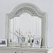 This modern fairy tale piece keeps all of the visual flair and extravagance but with a tinge of reality. This glorious four post bed set features a prominent wood grain, with a rustic inspired antique white finish. A linked ring motif dots the uppers of each piece, unifying a room from headboard to mirror. Round bun feet, combine with round finials to give your room a sense of symmetry. To add comfort, and enhance the fantasy feel a diamond tufted upholstery is added to the head board.
