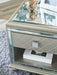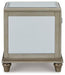 Glamorous, chic and sophisticated. This rectangular end table is made with a metallic silvertone finish, inset beveled mirror panels and drawer pulls adorned with faux crystals. No matter how you style it, this table is a stunning addition to your contemporary decor.