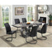 This dining set is an eclectic mix of styles. The table top features a beautiful wood grain and finish, but the base is two O-shaped pedestals in high gloss lacquer coating. The chairs have a leather upholstering along with an U-shaped base that's as contemporary as it gets. This is a bold addition to any home, but you can make it work with your unique sense of style.