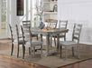 LAQUILA Dining Table, Gray, 60"L X 36"W X 30"H, 90.2lbs. This distinctly shaped table will help you build an outstanding dining space. The gray table top features a hint of warm tone, displaying a diamond wood grain pattern that plays off the cut-out corners. Playing off the same hue is the soft gray linen-like fabric, offering comfortable seating on the matching chairs and bench. The ladder back design shows protrusions on the sides of the chair; it's an element found on both ends of the trestle base as well, a sort of rugged style cleverly complemented by the wire-brushed frames.
